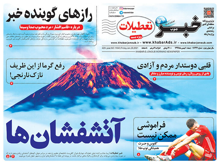 پرونده این شماره هم  که فردا جمعه منتشر می‌شود به آتشفشان‌های ایران و مشهور جهان اختصاص دارد. عناوین دیگر مطالب مهم سی‌وششمین‌ شماره «خبرجنوب تعطیلات» بدین شرح است: قلبی دوستدار مردم و آزادی(یادی از رومن رولان، رمان نویس و نویسنده مبارز و متفکر)، صدای ماندگار، شهر پریان، فراموشی ممکن نیست(کابوس و حسرت همیشگی توپ طلا)، مزاحم زیبا و رفع گرما از این ظریف نازک نارنجی!