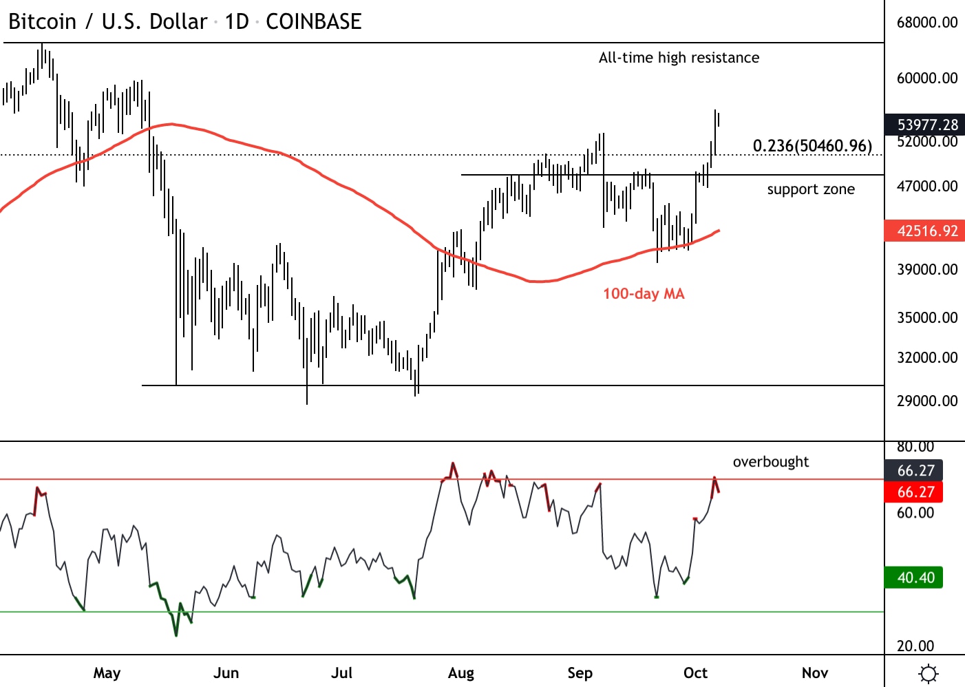 رالی بیت کوین بیش از 52 هزار دلار پشتیبانی می کند. مقاومت بعدی نزدیک به بالاترین سطح تاریخ