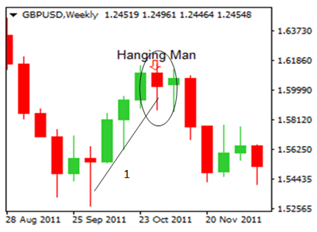 شمع مرد آویزان (که نام مناسبی دارد) یک شکل شمعدانی است که افزایش شدید فشار فروش را در اوج یک روند صعودی موجود نشان می دهد. این به طور کلی توسط بسیاری از فعالان بازار ایجاد می شود که معتقدند بازار به بالاترین سطح خود رسیده است و در نتیجه “خرس ها” بر “گاوها” برتری دارند. این را می توان در مشاهده کرد GBPUSD نمودار زیر که در آن واضح است که شمع قرمز در بالای روند صعودی در نتیجه فشار فروش انبوه ظاهر می شود.