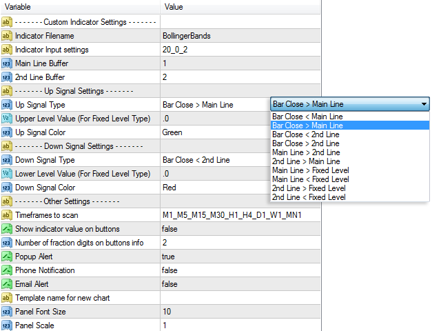 سپس نام فایل و تنظیمات نشانگر را وارد تنظیمات داشبورد می کنیم و خطوط نشانگر را به صورت “خط اصلی” و “خط دوم” معرفی می کنیم، سپس داشبورد مقادیر این 2 خط (یا 1 خط) را نسبت به قیمت یا نسبت به هر کدام رصد می کند. دیگر یا نسبت به یک مقدار ثابت و سیگنال می دهد.