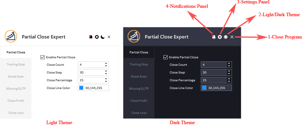 با Partial Close Expert، معامله گران می توانند a را تنظیم کنند بسته شدن جزئی سطح قفل کردن در سود، الف توقف دنباله دار سطح حفاظت از سود و محدود کردن زیان، الف سربه سر سطح برای اطمینان از شکستن معامله حتی اگر قیمت بر خلاف آنها حرکت کند و چندین عملکرد دیگر.