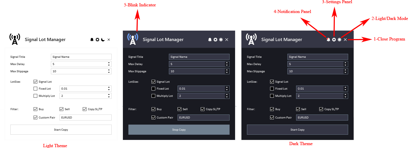 [ad_1] ✔️ سیگنال Lot Manager MT4©: https://www.mql5.com/fa/market/product/34864 ✔️ سیگنال مدیر لات MT5©: https://www.mql5.com/fa/market/product/41610 هشدار: لطفا سیگنال را ضمیمه کنید مدیر لات MT4/5 فقط در یک نمودار. توضیح پنل اصلی: دکمه بستن EA: این دکمه برای متوقف کردن Expert Advisor (EA) و حذف آن از نمودار استفاده می شود. دکمه روشن/تاریک: این دکمه برای جابجایی بین