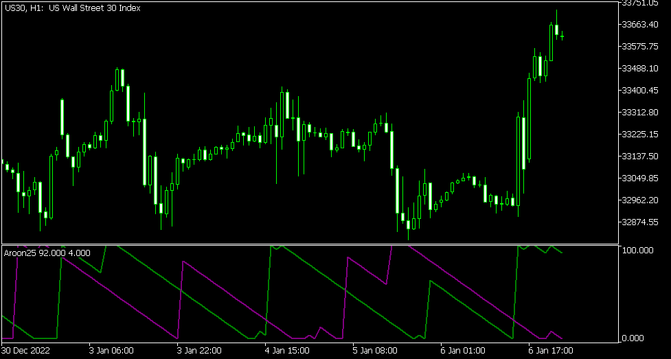 - نشانگر آرون – نشانگر Aroon نشان دهنده 2 خط بالا/پایین است که تعداد دوره های پس از بالا/پایین را اندازه گیری می کند. هنگامی که خط بالا از خط پایین بالاتر می رود به دنبال موقعیت طولانی هستیم و زمانی که خط پایین بالاتر از خط بالا می رود به دنبال موقعیت کوتاه هستیم.