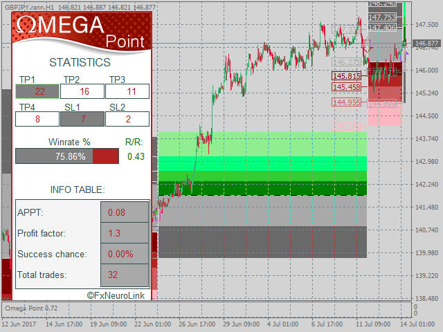 اندیکاتور Omega Point از یک سیستم چندلایه پیچیده استفاده می کند که توسط معامله گران برتر جهان استفاده می شود که به تعیین شروع روندهایی که به احتمال زیاد برای مدت طولانی دوام دارند کمک می کند. این سیستم از چندین حالت محاسبه روند پیچیده استفاده می کند که به همین دلیل اندیکاتور با مشخصات جفت ارزهای مختلف سازگار است و برای معاملات محافظه کارانه و تهاجمی مناسب است. این اندیکاتور محاسبات لازم را انجام می دهد و اطلاعات مهمی را در مورد نحوه انجام معامله در صورت ورود معامله گر به بازار نشان می دهد، بنابراین معامله گر همیشه می تواند محاسبه کند که چه سودی را انتظار دارد.