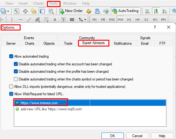- در MT4، Tools > Option > Expert Advisors > Allow WebRequest for URL listed
