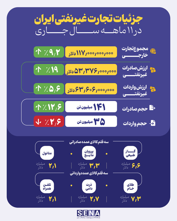 به گزارش خبرنگار پایگاه خبری بازار سرمایه ایران (سنا)، آمارهای جدید از تجارت خارجی در ۱۱ ماه سال ۱۴۰۳ حاکی از رشد ارزشی صادرات غیرنفتی و واردات است. بر اساس آمارهای منتشر شده مجموع تجارت خارجی ایران در این بازه زمانی معادل ۱۱۷ میلیارد دلار بوده که رشد ۹.۲ درصدی را نسبت به مدت مشابه سال گذشته نشان می دهد.