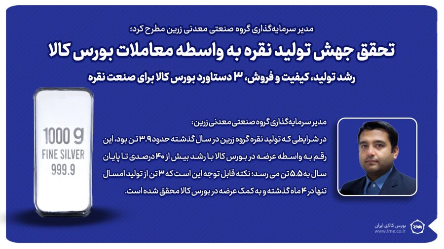 پاافشار افزود: عرضه نقره در بورس کالا باعث افزایش چشمگیر تولید این فلز شده است. به طوری که تولید نقره گروه زرین که در سال گذشته ۳.۹ تن بود، طبق برآوردها تا پایان امسال به ۵.۵ تن افزایش می یابد و پیشبینی میشود با توجه به روند فروش تولیدات در بورس، این رقم در سال آینده به ۱۰ تن افزایش یابد.