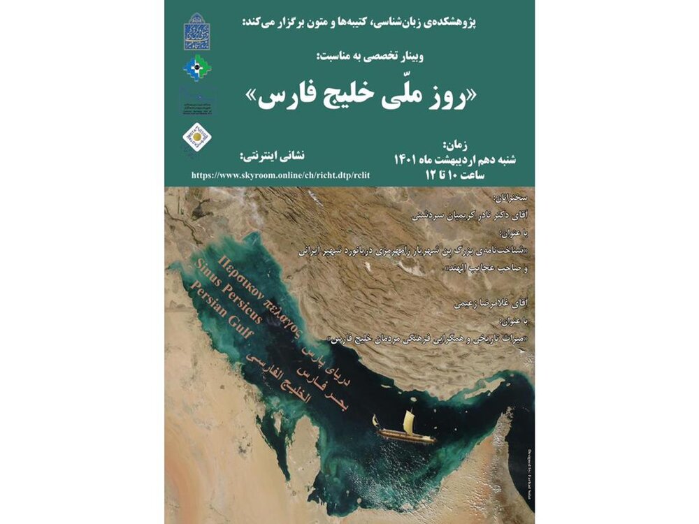 به گزارش ایسنا، وبینار تخصصی روز ملی خلیجفارس به همت پژهشکده زبانشناسی، کتیبهها و متون شنبه دهم اردیبهشت ۱۴۰۱ همزمان با روز ملی خلیجفارس از ساعت ۱۰ تا ۱۲ برگزار میشود.
