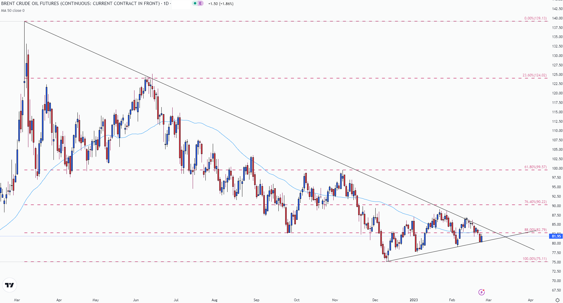 در حالی که MA 50 روزه (میانگین متحرک) به عنوان مقاومت در 83.44 دلار باقی مانده است، نفت خام برنت همچنان سرکوب شده و در حدود 81.95 دلار حرکت می کند. اگرچه کاهش عرضه به طور موقت با کاهش تقاضا جبران شد، خط روند نزولی از حرکت سال گذشته اکنون به عنوان مقاومت در سطح روانی 82.00 دلار در هر بشکه ظاهر شده است. یک حرکت بالاتر، اصلاح 88 درصدی حرکت 2022 را در 82.79 در کانون توجه قرار می دهد و راه را برای شکست مقاومت خط روند نزولی هموار می کند.