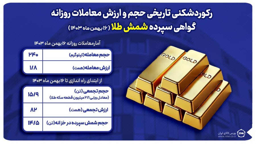 براساس آمارهای موجود، بیش از ۱۴.۵ تن شمش طلا در خزانه فلزات گرانبهای بورس کالای ایران سپرده شده است.