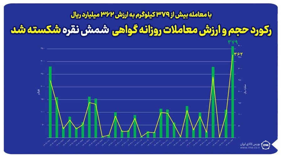 به گزارش خبرنگار پایگاه خبری بازار سرمایه ایران(سنا)، دیروز با معامله بیش از ۳۳۸ کیلوگرم نقره به ارزش ۳۲۴ میلیارد ریال، رکورد حجم و ارزش معاملات روزانه گواهی شمش نقره شکسته شد.