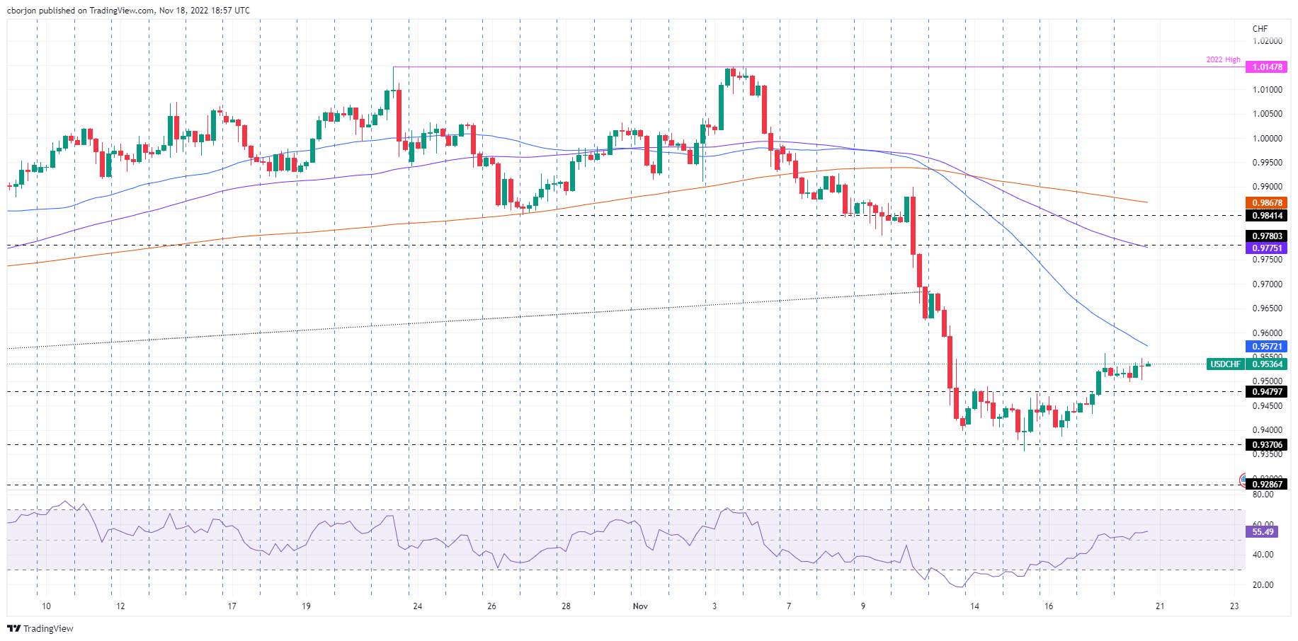 USDCHF برای پنجمین روز متوالی پس از کاهش بیش از 5 درصدی در هفته گذشته پس از گزارش تورم آمریکا که کمتر از حد انتظار بود، افزایش یافت. با این حال، اظهارنظرهای جنگ طلبانه مقامات فدرال رزرو (فدرال رزرو) در طول هفته، دلار آمریکا (USD) را به ضرر فرانک سوئیس (CHF) تقویت کرد. در زمان نوشتن این مقاله، USDCHF با 0.9536 معامله می شود که بالاتر از قیمت افتتاحیه آن 0.26٪ است.
