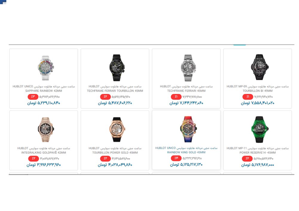 [ad_1] نام و مدل قیمت ساعت مچی مردانه هابلوت سوئیس HUBLOT MP-۰۹ TOURBILLON BI ۴۹MM ۷,۵۵۸,۴۰۱,۰۲۰ تومان ساعت مچی مردانه هابلوت سوئیس HUBLOT TECHFRAME FERRARI ۴۵MM ۷,۱۴۴,۲۴۲,۰۶۰ تومان ساعت مچی مردانه هابلوت سوئیس HUBLOT TECHFRAME FERRARI TOURBILLON ۴۵MM ۵,۴۸۷,۶۰۶,۲۲۰ تومان ساعت مچی مردانه هابلوت سوئیس HUBLOT UNICO SAPPHIRE RAINBOW ۴۲MM ۵,۲۳۹,۱۱۰,۸۴۰ تومان ساعت مچی مردانه