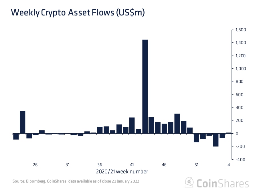 بر اساس گزارش روز دوشنبه مدیر دارایی‌های دیجیتال CoinShares، صندوق‌های ارزهای دیجیتال طی هفت روز منتهی به 21 ژانویه، 14.4 میلیون دلار پول سرمایه‌گذار جدید به ارمغان آوردند و به رگه‌ای از پنج هفته متوالی خروج پایان دادند.
