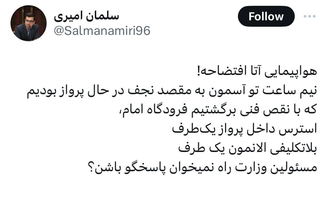 یک فعال رسانهای نیز در صفحهی شخصی خود نوشت: هواپیمایی آتا افتضاحه. نیم ساعت تو آسمون به مقصد نجف در حال پرواز بودیم که با نقص فنی برگشتیم فرودگاه امام . استرس داخل پرواز یک طرف بلاتکلیفی الانمون یک طرف . مسئولان وزارت راه نمیخوان پاسخگو باشن؟