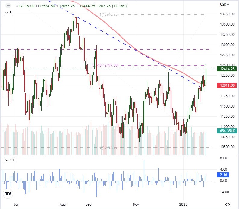 برای یک بازار برتر در لیست “باید تماشا” من، EURUSD به راحتی جالب ترین است. این بزرگترین مؤلفه شاخص DYX است، بنابراین عملکرد فنی چشمگیر مشابهی در نمایش داده می شود. برای این متقاطع بنچمارک، 1.2 درصد بالاترین میزان شارژ از 11 نوامبر بود – زمانی که جفت چرخش قطعی خود را پس از انتشار CPI ایالات متحده انجام داد. علاوه بر این، این اتهام، نرخ ارز را به بالاتر از نقطه میانی ژانویه 2021 تا موج نزولی سپتامبر 2022 رساند. گفته می شود، وزن اساسی در اینجا جدی است. این نقدشوندگی ترین ارز متقاطع است، بنابراین وضعیت دلار در اینجا کاهش می یابد. این امر بررسی دقیقتری بر وضعیت نرخ بهره نسبی میکند و بانک مرکزی اروپا چرخه افزایش نرخ خود را بسیار پایینتر از فدرال رزرو محدود میکند. آیا این عامل موثر خواهد بود؟