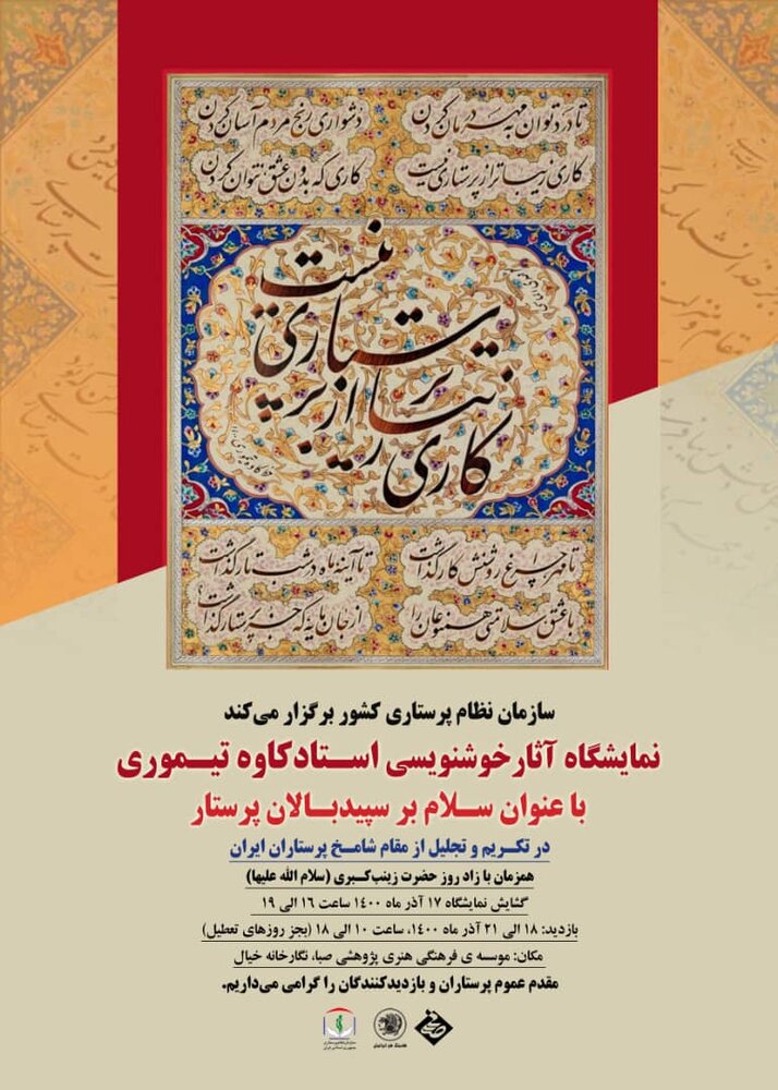 صبا از ۱۷ تا ۲۱ آذرماه همبال با خوشنویسی های کاوه تیموری و با حضور تمامی علاقه مندان و بازدیدکنندگان به سپیدبالان پرستار و با طنین نستعلیق ایرانی و هنر تذهیب، سلام خواهد گفت.