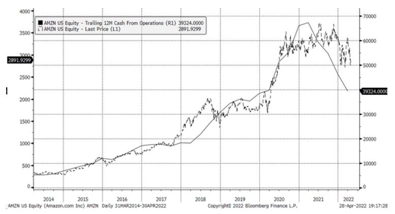 نمودار زیر، توسط بلومبرگ، نشان می دهد که چگونه وجه نقد حاصل از عملیات از نیمه اول سال 2021 کاهش یافته است. در واقع، نقدینگی حاصل از عملیات تا قبل از تأسیس، رونق داشت. جف بزوس در ماه مه 2021 اعلام بازنشستگی پیش از موعد کرد. از زمانی که او رفت، معیارها در حال از بین رفتن هستند.