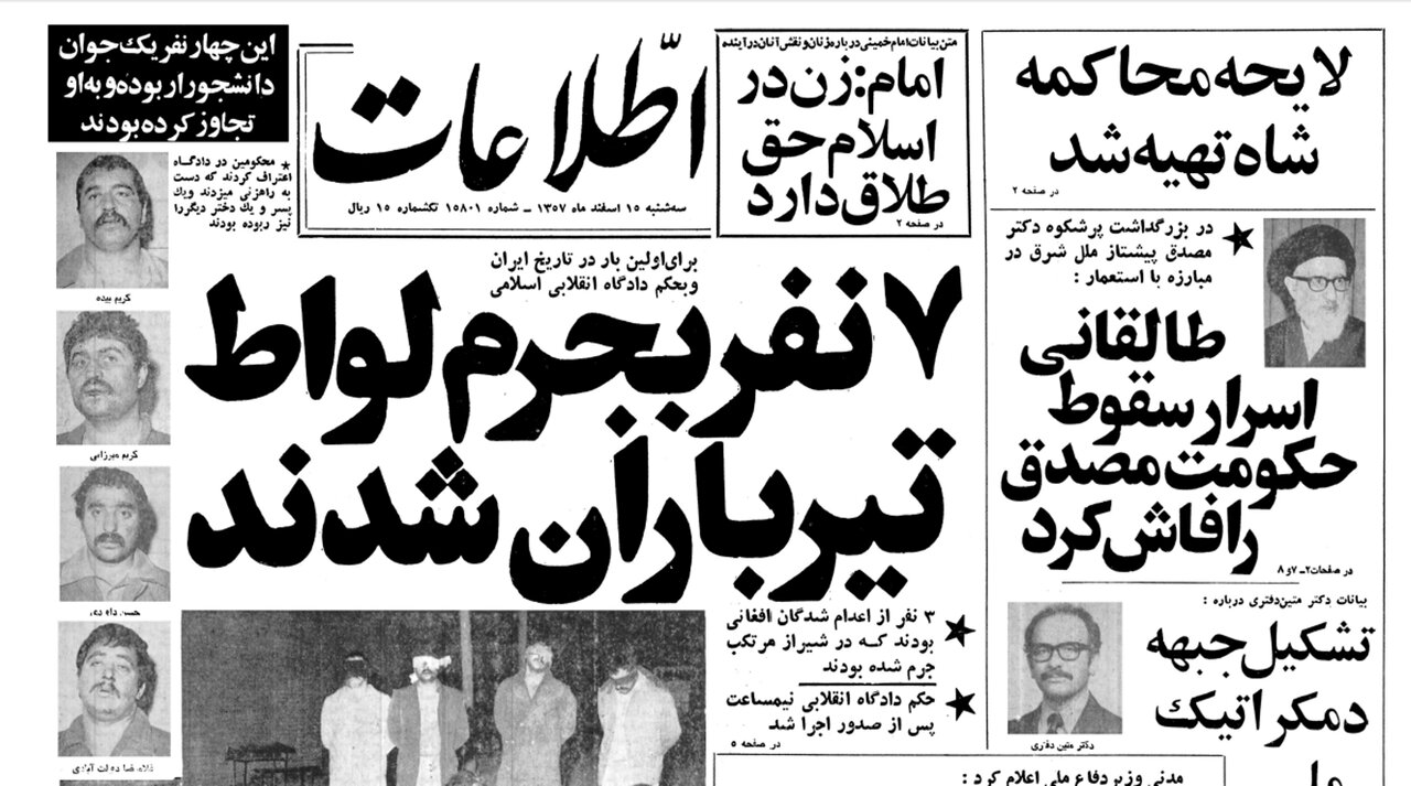 به گزارش خبرگزاری خبرآنلاین، شامگاه دوشنبه ۱۴ اسفند، سه هفته پس از پیروزی انقلاب، ۷نفر به اتهام لواط در زندان قصر تهران و غسالخانهی عمومی شیراز به حکم دادگاه انقلاب تیرباران شدند. ماجرا از این قرار بود که روز یکشنبه ۱۳ اسفند، جوانی دانشجو به کمیتهی امام مستقر در مسجد خیابان آریانا، شکایت کرد که چهار مرد مسلح او را به عنوان رساندن به مقصد سوار اتوبوس کرده و در پارکینگی واقع در انتهای خیابان آریانا، مورد ضرب و شتم و تجاوز قرارش دادهاند. در پی این شکایت چند تن از ماموران مسلح کمیته به محل رفتند، و پس از جستوجو چهار متهم را شناسایی کردند. متهمان در نهایت در ساعت ۴ بامداد روز دوشنبه ۱۴ اسفند به دام افتادند و تسلیم دادگاه انقلاب اسلامی شدند. روزنامهی اطلاعات فردای آن روز در پی اعلام این خبر نوشت: