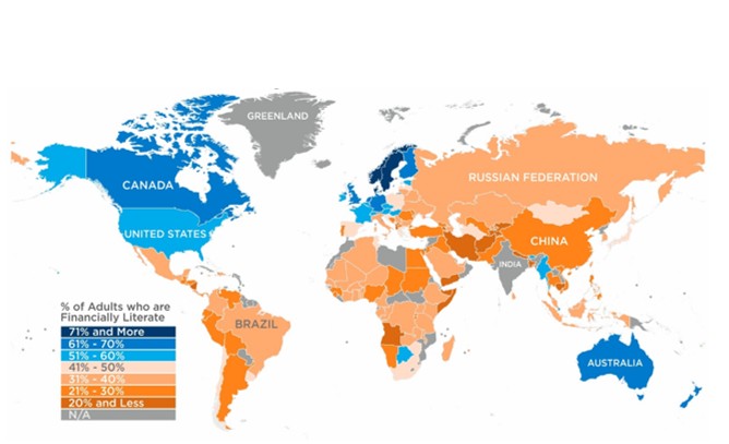 در حال حاضر بالاترین سطح سواد مالی در سراسر جهان، در کشورهای دارای اقتصاد پیشرفته ، به ویژه اروپای غربی و کشورهای انگلیسی زبان وجود دارد. در آمریکای جنوبی هیچ کشوری وجود ندارد که بیش از ۵۰٪ مردم سواد مالی داشته باشند و این سطح فقط یک کشور در کل آفریقا است.