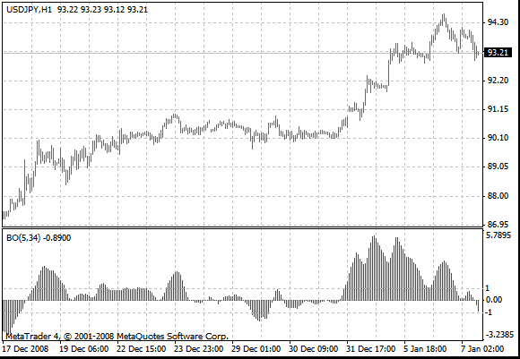 شاخص BO تفاوت بین میانگین متحرک ساده 5 نواری (SMA) و میانگین متحرک ساده 34 نواری (SMA) را محاسبه می کند. این خطوط SMA بر اساس بسته شدن میله نیستند، بلکه بر اساس نقطه میانی میله هستند که میانگین بالا و پایین آن است. سپس نوارهای هیستوگرام را بر اساس مقدار اختلاف خطوط SMA ترسیم می کند. همچنین هر زمان که مقدار نوار فعلی بیشتر از نوار قبلی باشد، نوارهای سبز و زمانی که از نوار قبلی کمتر است، نوارهای قرمز را ترسیم می کند.