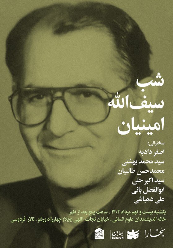 شب سیفالله امینیان در خانه اندیشمندان علوم انسانی واقع در خیابان نجاتاللهی (ویلا)، چهارراه ورشو، سالن فردوسی برگزار میشود.