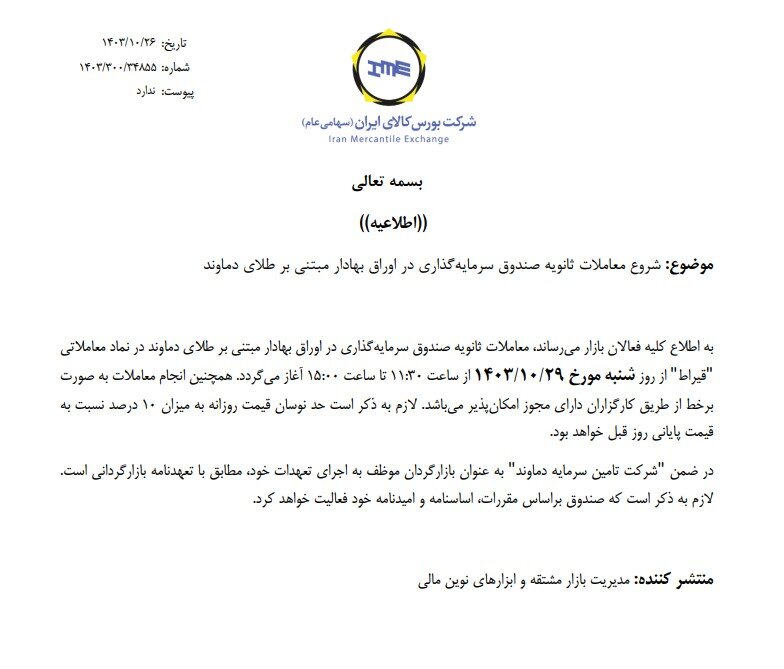 به گزارش پایگاه خبری بازار سرمایه ایران(سنا)، بر اساس این اطلاعیه، معاملات ثانویه صندوق سرمایه گذاری در اوراق بهادار مبتنی بر طلای دماوند در نماد معاملاتی “قیراط” از روز شنبه ۲۹ دی ماه از ساعت ١١:٣٠ تا ساعت ۱۵ آغاز می‌شود.