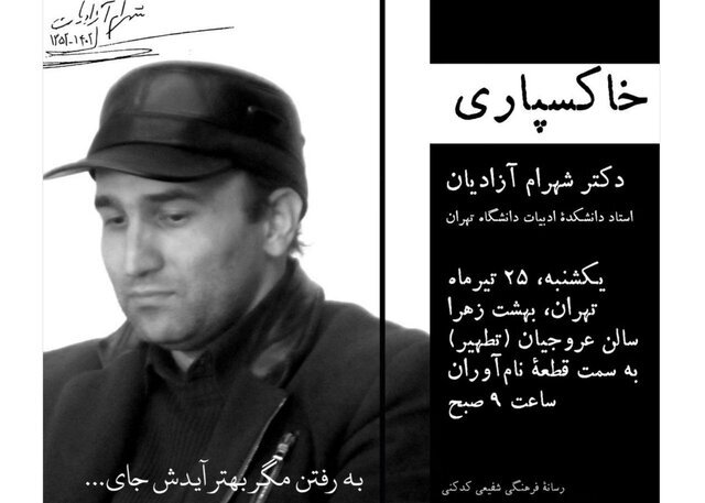 صفحه منسوب به محمدرضا شفیعی کدکنی با اشتراک گذاشتن اطلاعیهای نوشته است: «مراسم تشییع پیکر و خاکسپاری دکتر شهرام آزادیان، استاد دانشکده ادبیات دانشگاه تهران روز یکشنبه، ۲۵ تیرماه از ساعت ۹ صبح در بهشت زهرا از سالن عروجیان (تطهیر) به سمت قطعه نامآوران برگزار خواهد شد.»