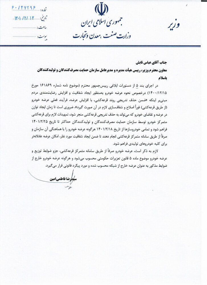 بر اساس نامه‌ای که وزیر صمت به عباس تابش معاون وزیر و رییس سازمان حمایت ابلاغ کرده تمامی خودروسازان چه دولتی و چه خصوصی تا زمانی که سیستم قرعه کشی پا برجاست، باید از طریق قرعه کشی محصولات خود را بفروشند.