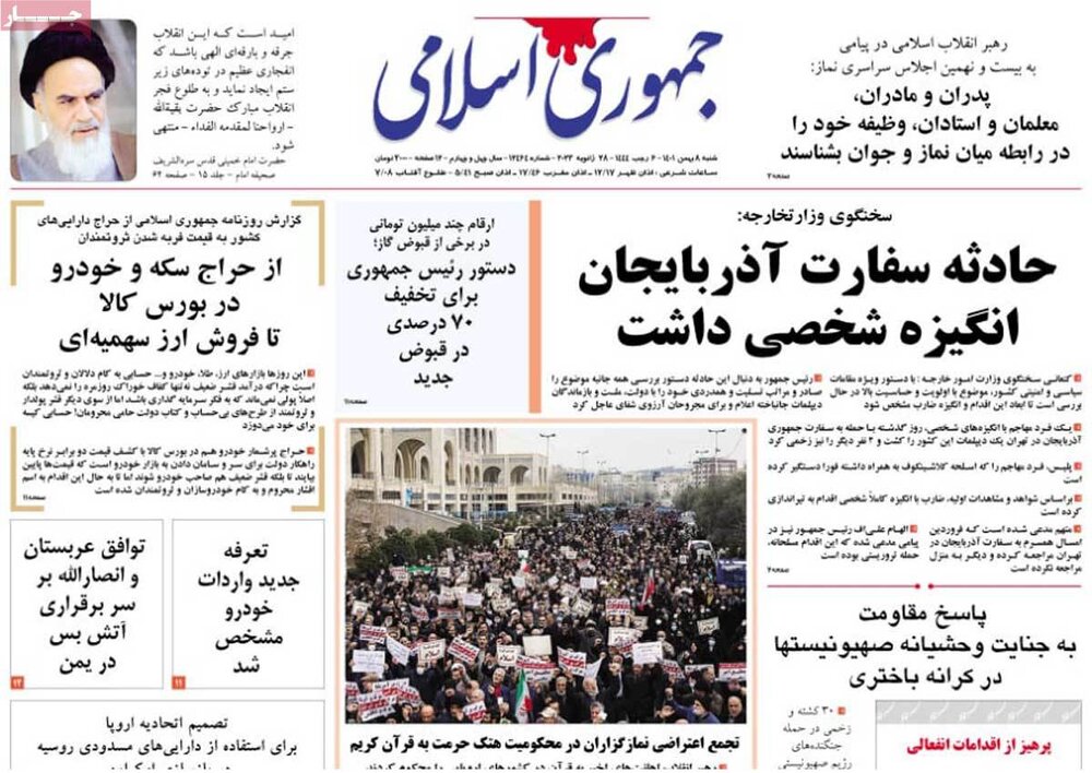 حمله مسلحانه به سفارت آذربایجان در خیابان پاسداران تهران و پیام رهبرمعظم انقلاب به اجلاس نماز از تیترهای اصلی امروز مطبوعات است.