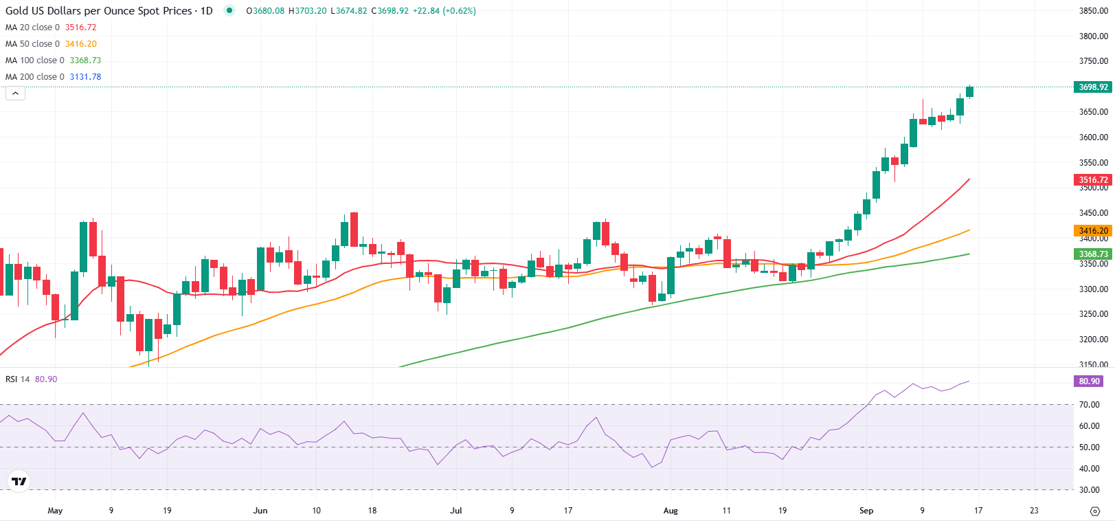 [ad_1] طلا (Xau/USD) در نیمه دوم روز سه شنبه تجمع خود را تمدید کرد و به رکورد جدید بالاتر از 3700 دلار رسید. فشار فروش گسترده ای که در اطراف دلار آمریکا (USD) وجود دارد ، به Xau/USD کمک می کند تا با افزایش سرمایه گذاران برای اعلامیه های سیاست پولی فدرال رزرو (FED) در