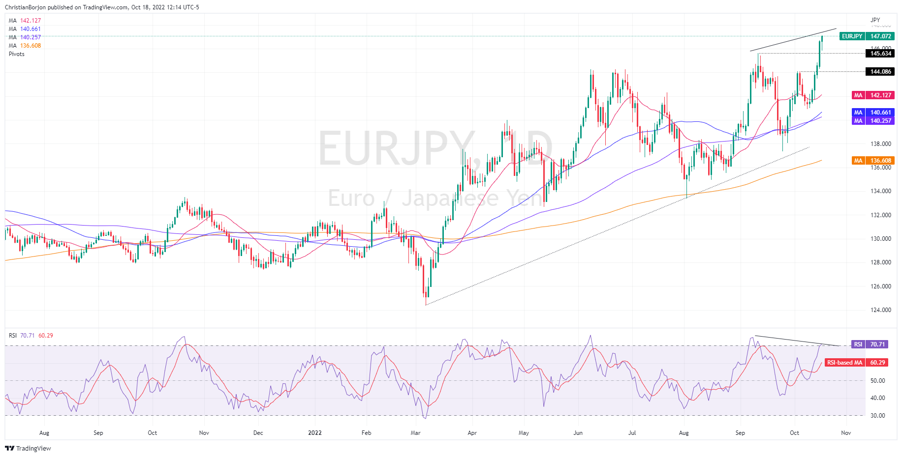 نمودار روزانه نشان می دهد که EUR/JPY به سمت بالا حرکت می کند. روز دوشنبه، جفت ارز متقاطع به بالاترین حد خود در هشت سال گذشته رسید و در اوایل جلسه آمریکای شمالی، به بالاترین سطح YTD در 147.12 رسید. نکته قابل توجه این است که با صعود EUR/JPY، ثبت بالاترین سطح، شاخص قدرت نسبی (RSI) چنین نبود، بنابراین یک واگرایی منفی بین RSI و عملکرد قیمت میتواند راه را برای یک حرکت بازگشت متوسط قبل از ادامه صعود هموار کند.