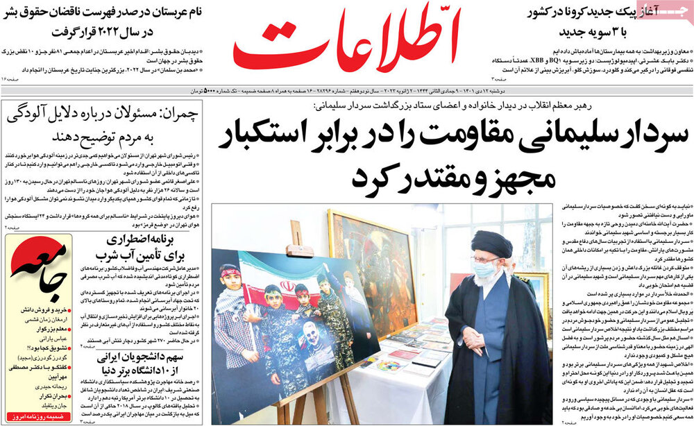بیانات رهبرمعظم انقلاب در دیدار خانواده سرلشکرشهید قاسم سلیمانی و سخنان رئیس جمهور در کنگره بزرگداشت مرحوم آیت الله مصباح یزدی از عناوین مطبوعات امروز است.