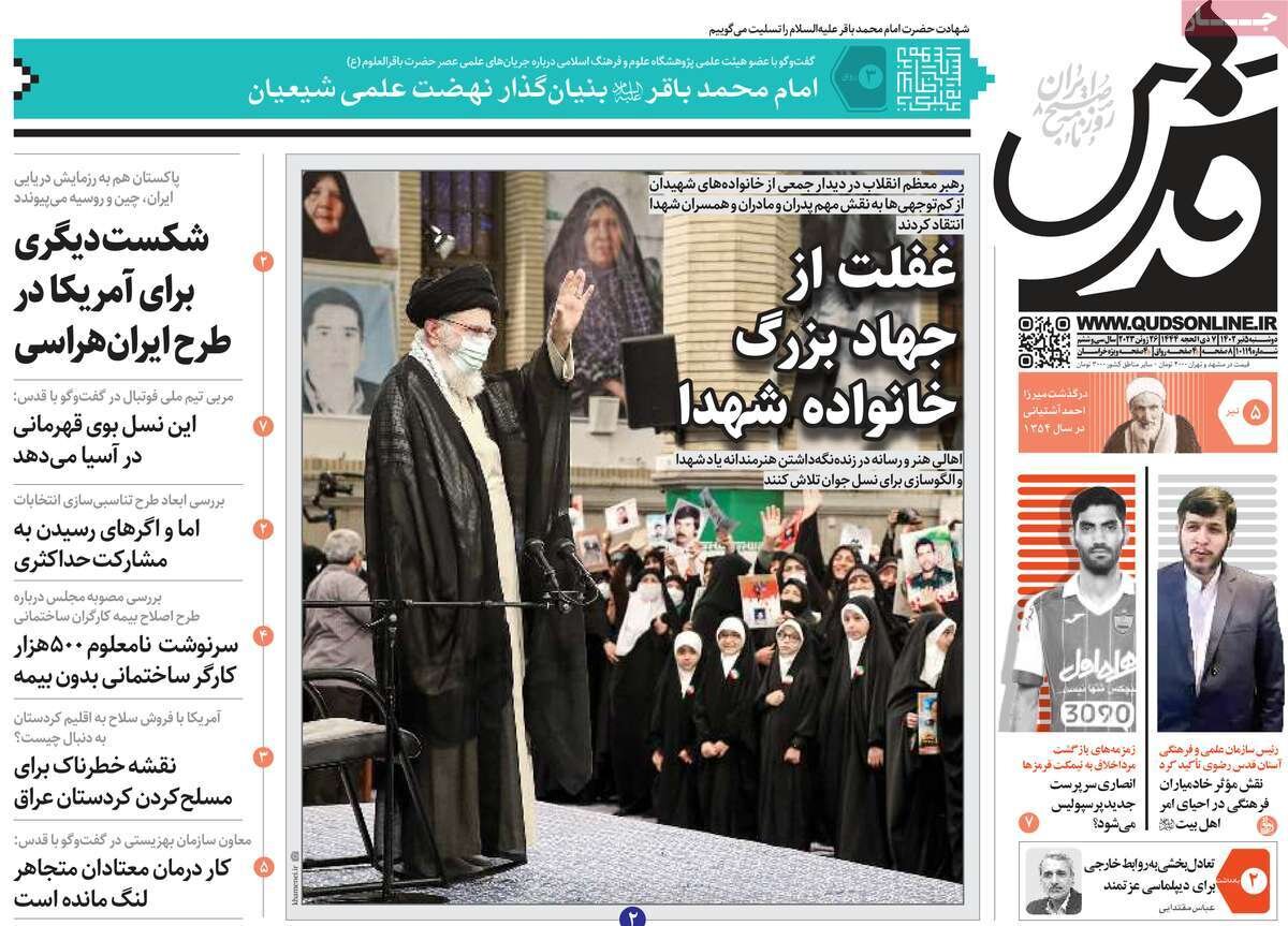دیئار خانواده های معظم شهدا با رهبرمعظم انقلاب و پس لرزه های وقایع روسیه از تیترهای مطبوعات امروز است.