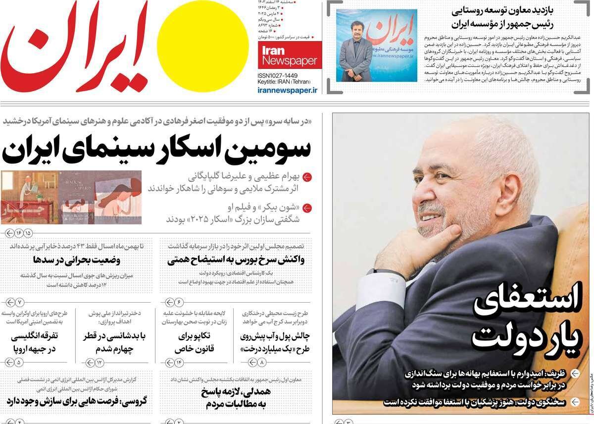 صفحه اول روزنامه های سه شنبه ۱۴ اسفند ۱۴۰۳/ سناریوهای دولت بعد از خروج ظریف/ کابینه در تنگنا