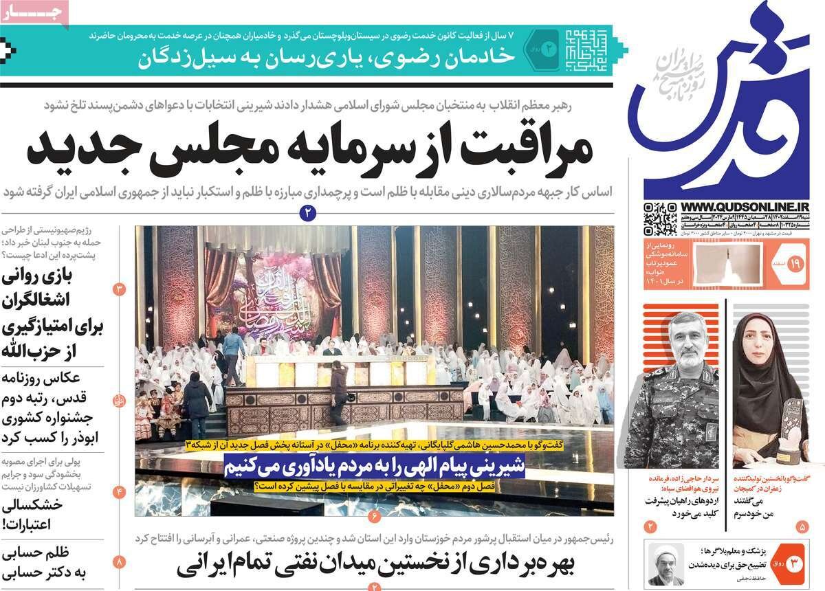 بیانات رهبرمعظم انقلاب در باره تندرویهای نمایندگان مجلس دوازدهم، سفر رئیس جمهور به خوزستان و… از تیترهای مطبوعات امروز است.