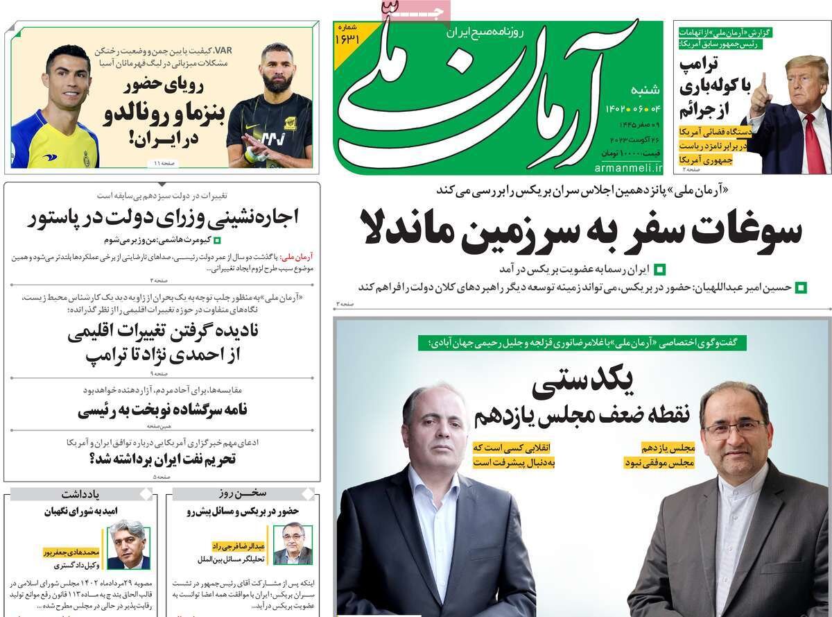 عضویت ایران در بریکس مهمترین تیتر روزنامه های امروز است.