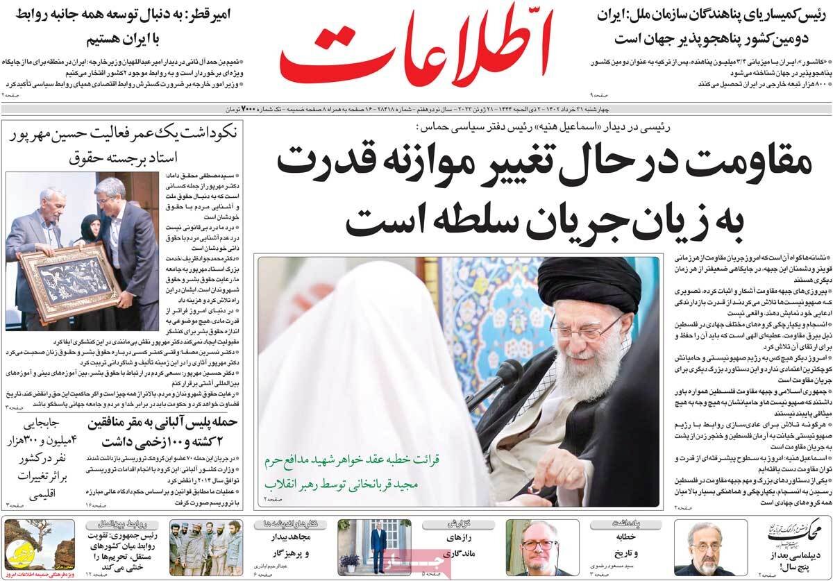 دیدار اسماعیل هنیه با رهبرانقلاب و گزارش رئیسی در دومین سال انتخاب خود به عتوان رئیس جمهور از عناوین مطبوعات امروز است.
