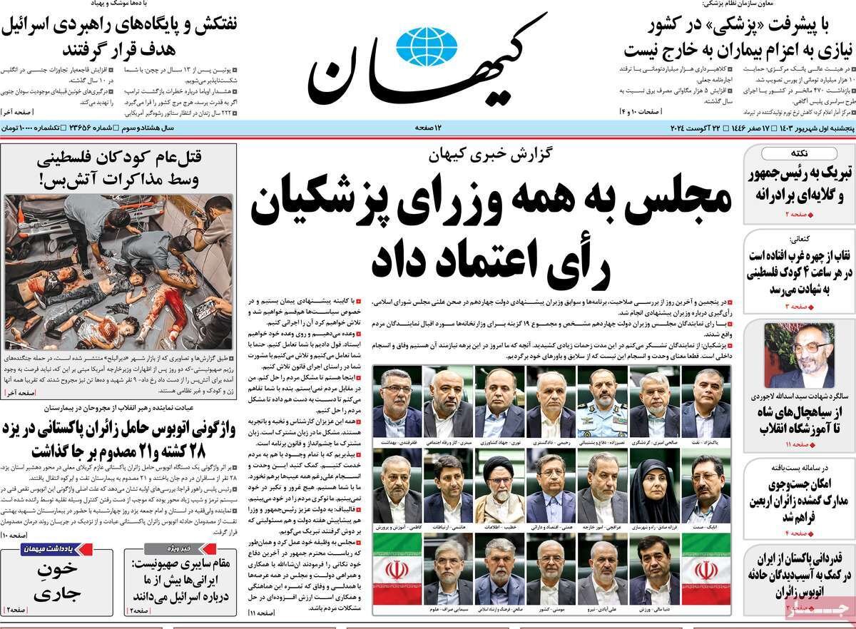 بازاب رای اعتماد مجلس به اعضای کابینه پزشکیان، تیتر اول روزنامه های امروز است.