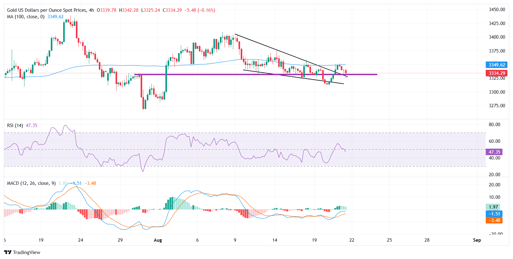 [ad_1] طلا پس از عدم حفظ سود بالاتر از 3،350 دلار بالاتر از 3،330 دلار است. یک دلار قوی تر و خزانه داری محکم تر به دست می آورد. تمرکز تمرکز به سمپوزیوم جکسون هول ، با سخنرانی صندلی فدرال پاول در روز جمعه. طلا (Xau/USD) روز پنجشنبه پس از پایین آمدن به 3،325 دلار