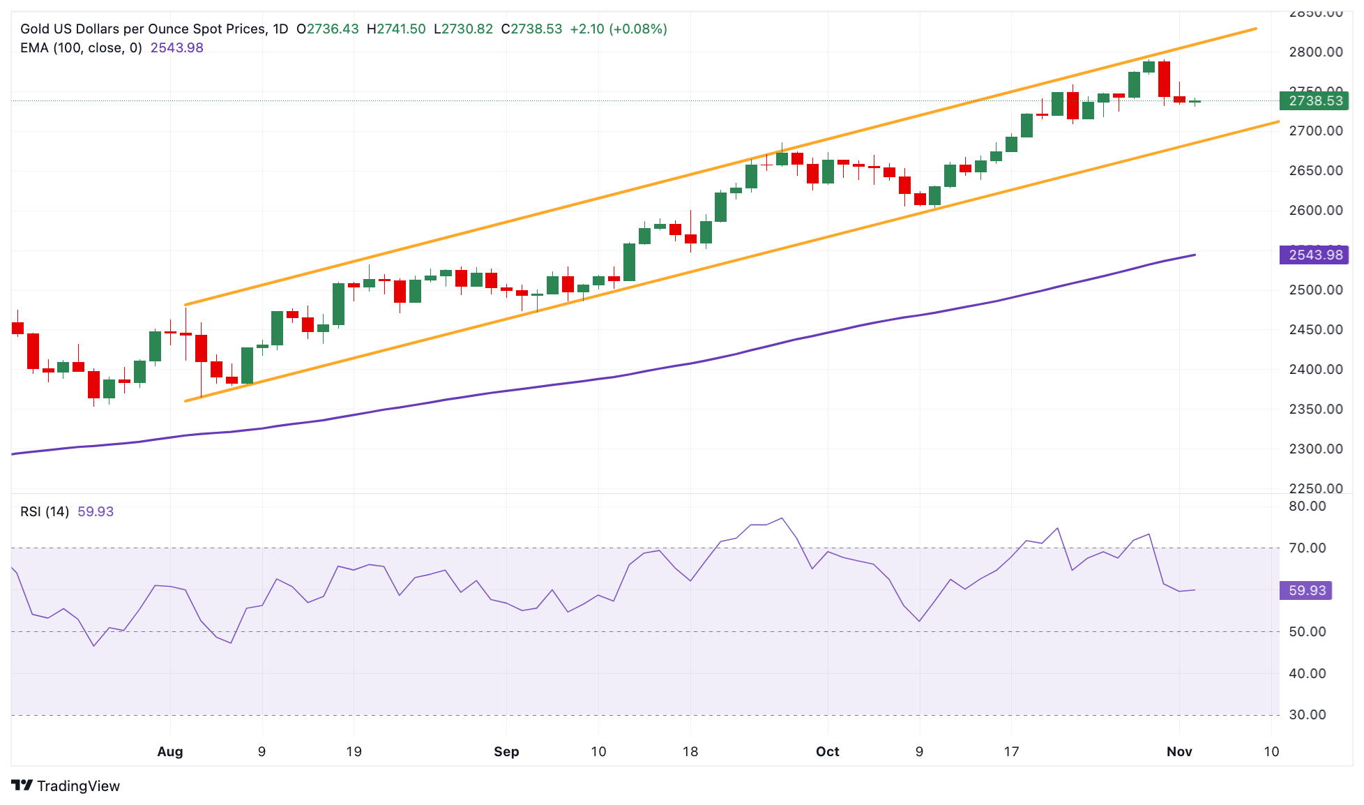 قیمت طلا در روز افزایش می یابد. تصویر مثبت این فلز گرانبها با حفظ قیمت بالاتر از میانگین متحرک نمایی 100 روزه (EMA) در نمودار روزانه غالب است. علاوه بر این، شاخص قدرت نسبی 14 روزه (RSI) بالاتر از خط وسط 50 نزدیک به 60.20 قرار دارد، که نشان می دهد سطح حمایت احتمالاً به جای شکستن باقی می ماند.