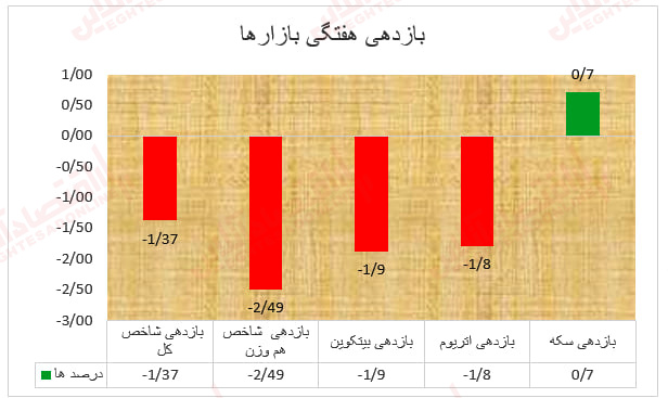 اما سکه تنها دارایی‌ای بود که در هفته گذشته در میان دارایی‌های مورد بررسی بازدهی مثبت ثبت کرد و توانست با رشد ۰.۷ درصدی ناشی از رشد نرخ دلار در بازار آزاد عایدی قابل قبولی برای سرمایه‌گذاران خود به ارمغان بیاورد.