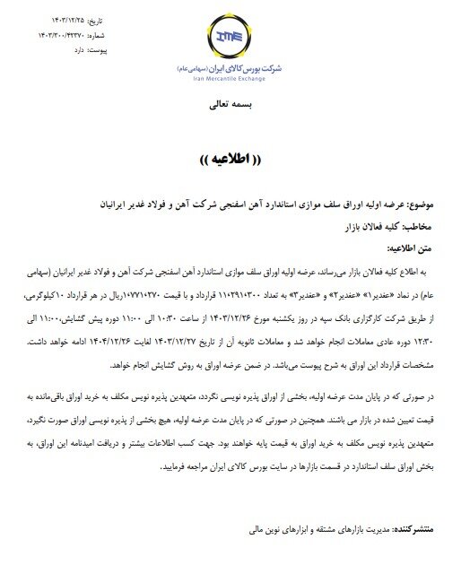 به گزارش پایگاه خبری بازار سرمایه ایران(سنا)، عرضه اولیه اوراق سلف موازی استاندارد آهن اسفنجی شرکت آهن و فولاد غدیر ایرانیان، در نماد «عغدیر۱»، «عغدیر۲» و «عغدیر۳» به تعداد ۱۱ میلیون و ۲۹۱ هزار و ۳۰۰ قرارداد و با قیمت ۱،۷۷۱،۲۷۰ ریال در هر قرارداد ۱۰ کیلوگرمی از طریق کارگزاری بانک سپه امروز انجام میشود.