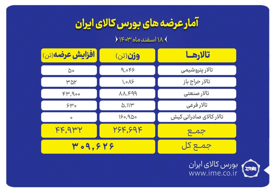 امروز همچنین ۹ هزار و ۹۶ تن مواد پلیمری و شیمیایی در تالار پتروشیمی و فرآوردههای نفتی روی تابلو میرود.