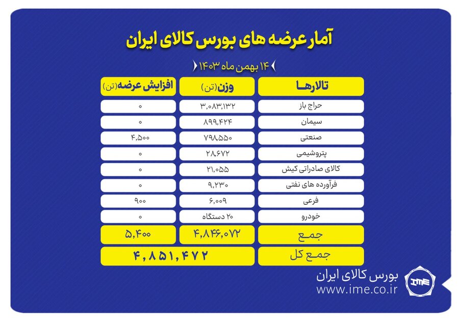 تالار حراج باز هم میزبان عرضه ۸۹۸ هزار و ۵۰۰ تن سنگ آهن دانه بندی، ۵۱۰ هزار و ۸۰۰ تن کنسانتره سنگ آهن، ۱۵۲ هزار تن سنگ آهن کلوخه، ۱۴۸ هزار و ۵۰۰ تن وکیوم باتوم، ۳۰۰ تن سولفور مولیبدن و ۳۲ تن کنسانتره فلزات گرانبها است.