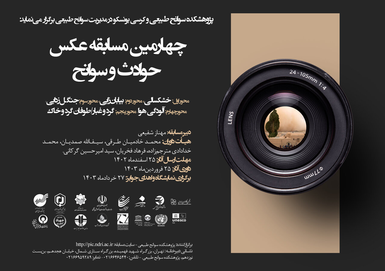 در همین راستا، پژوهشکده سوانح طبیعی و کرسی یونسکو در مدیریت سوانح طبیعی در نظر دارد نسبت به برگزاری چهارمین مسابقه عکس – حوادث و سوانح با محورهای زیر اقدام کند:
