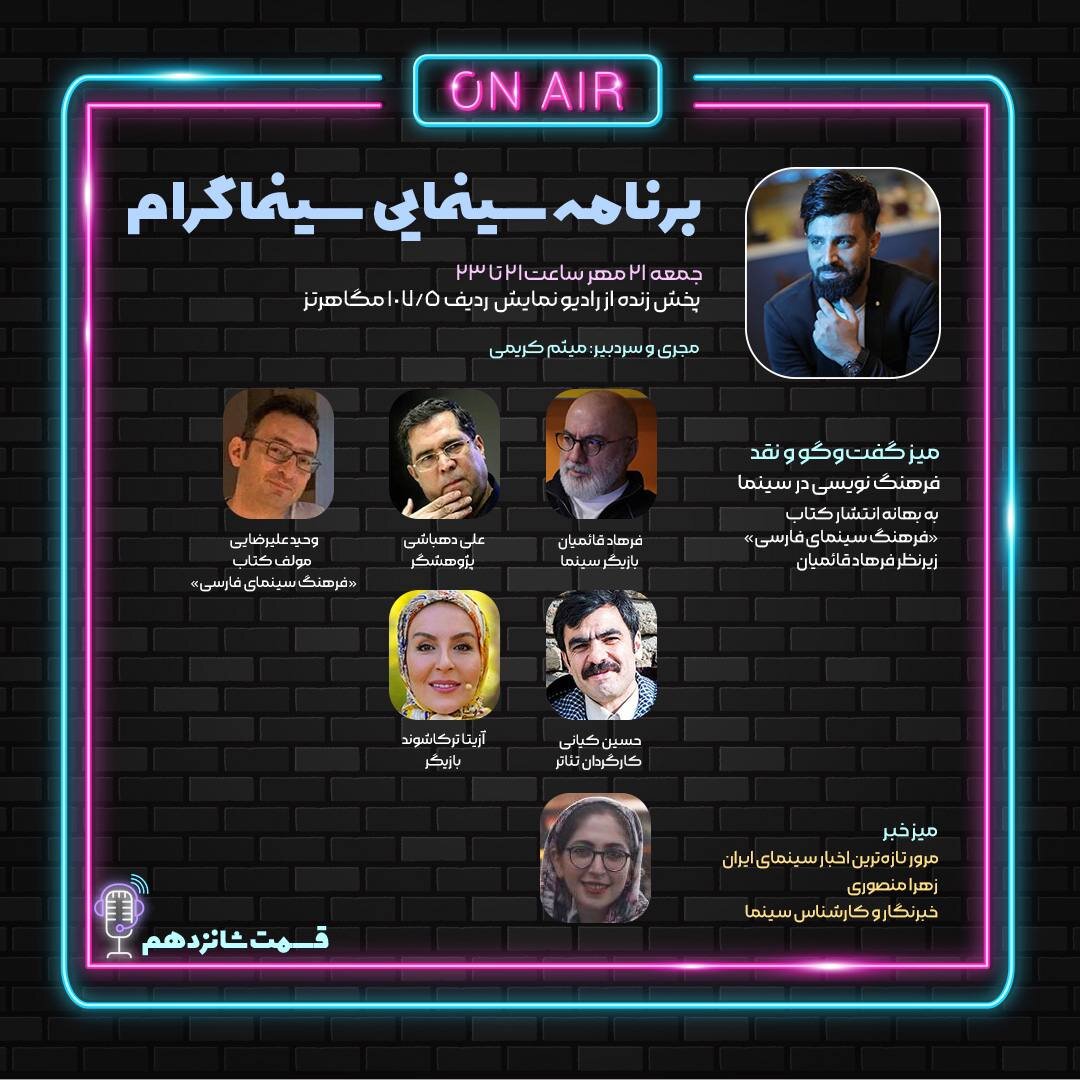 به گزارش خبرگزاری خبرآنلاین ،قسمت شانزدهم این برنامه رادیویی-سینمایی جمعه ۲۱ مهر ۱۴۰۲(امشب) به موضوع فرهنگ نویسی در سینما به بهانه انتشار کتاب «فرهنگ سینمای فارسی» زیرنظر فرهاد قائمیان اختصاص دارد. این برنامه که از ساعت ۲۱ تا ۲۳ به طور زنده از رادیونمایش ردیف ۱۰۷/۵ مگاهرتز پخش میشود، در میز گفت و گوی خود میزبان فرهاد قائمیان بازیگر سینما، علی دهباشی پژوهشگر، وحید علیرضایی مولف کتاب «فرهنگ سینمای فارسی» از کتب نشر عنوان،حسین کیانی کارگردان تئاتر و آزیتا ترکاشوند بازیگر خواهد بود. همچنین زهرا منصوری خبرنگار و کارشناس سینما در میز خبر این برنامه تازهترین اخبار سینمای ایران را مرور خواهد کرد.
