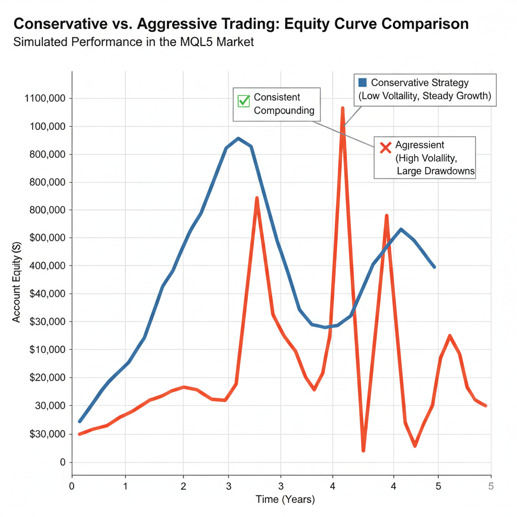 برعکس ، تجارت محافظه کارانه در اولویت حفظ سرمایه و دستاوردهای سازگار ، هرچند کوچکتر است. این رویکرد قدرت ترکیب را با گذشت زمان به دست می آورد و در نهایت منجر به رشد قوی تر و پایدار می شود. در اینجا نحوه سود شما در بازار MQL5 آورده شده است: