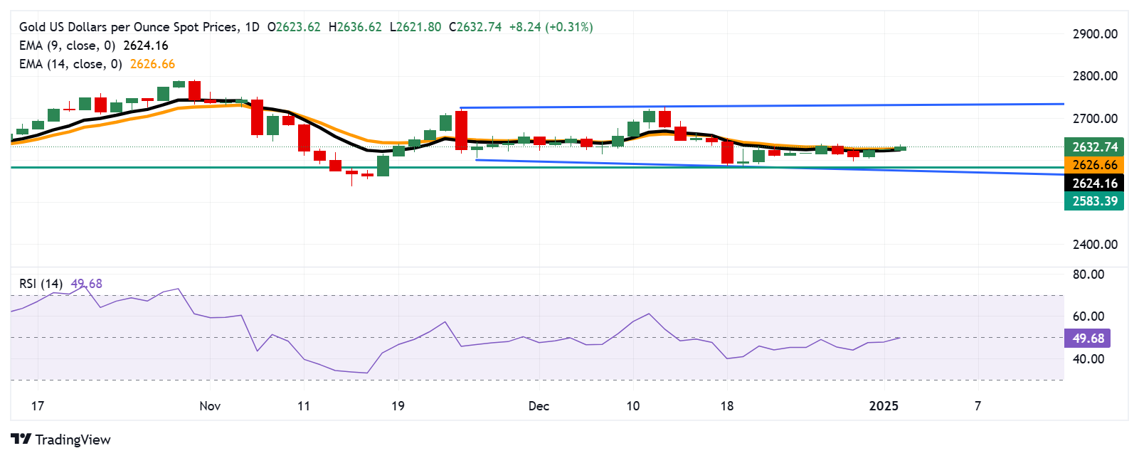 قیمت طلا در روز پنجشنبه نزدیک به 2630.00 دلار در هر اونس تروی معامله می شود، در حالی که نمودار روزانه نشان دهنده فاز تثبیت زمانی است که فلز به سمت چپ حرکت می کند. با این حال، قیمت فلز زرد بالاتر از میانگین متحرک نمایی 9 و 14 روزه (EMAs) حرکت می کند که نشان دهنده یک تغییر صعودی در حرکت کوتاه مدت است. علاوه بر این، شاخص قدرت نسبی 14 روزه (RSI) در اطراف علامت 50 قرار دارد که نشان دهنده یک احساس خنثی است.