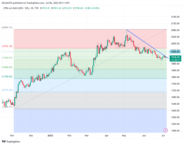 [ad_1] قیمت طلا (XAU/USD)، نمودارها و تجزیه و تحلیل: قیمت طلا همچنان با چشم انداز افزایش بیشتر نرخ بهره جهانی گیر کرده است. دقایق این هفته FOMC همچنان بازارهایی را به دنبال افزایش در ایالات متحده در این ماه دارد. در برابر آن پسزمینه، داراییهای بدون بازده با مشکل مواجه خواهند شد. توصیه شده توسط